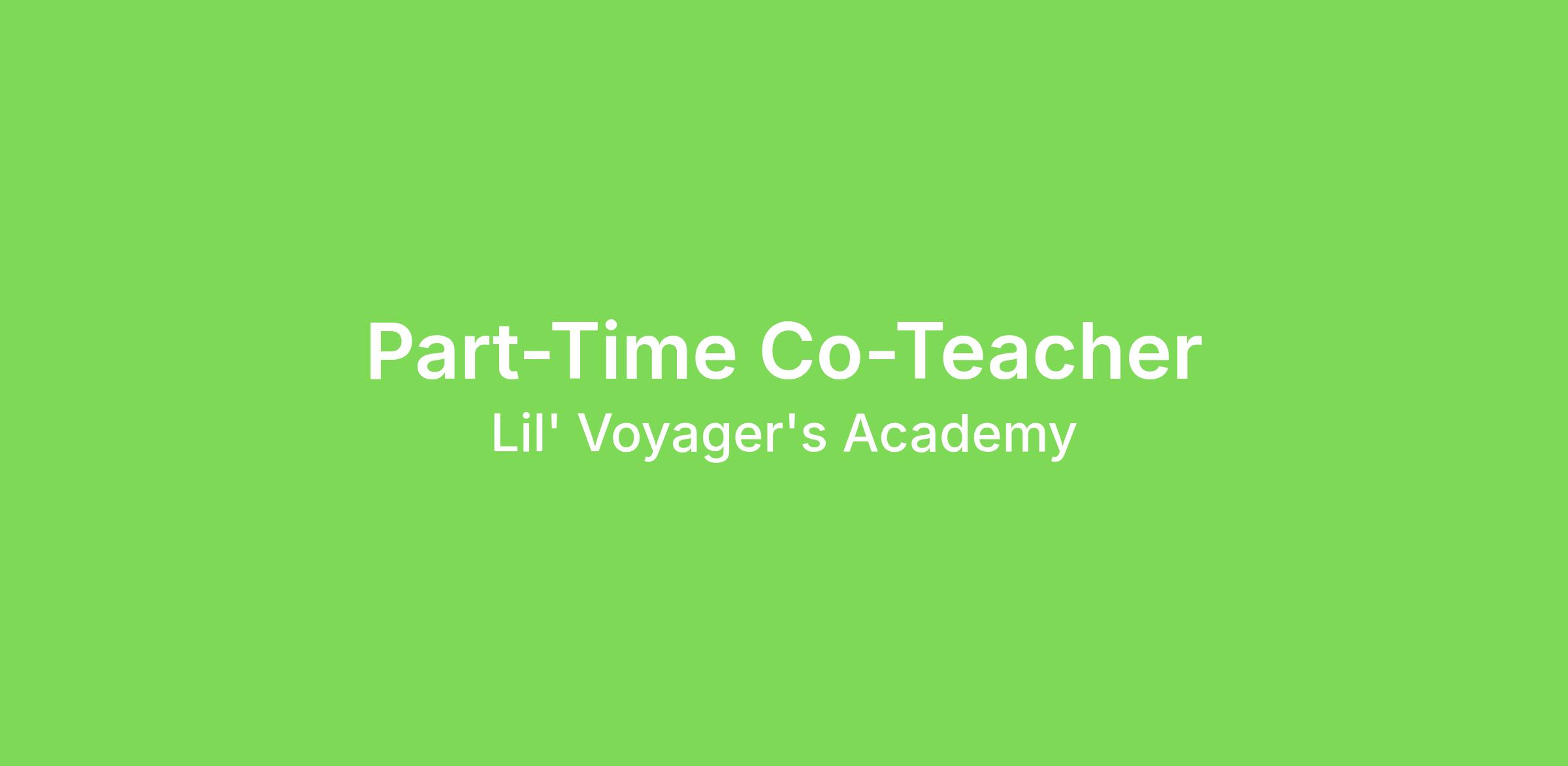 Lil’ Voyagers Academy is seeking a dedicated and enthusiastic Part-Time Co-Teacher to join our team of early childhood education professionals. As a co-teacher, you will assist your teacher in creating a nurturing, engaging, and safe learning environment for young children, ensuring their development and growth through age-appropriate activities.