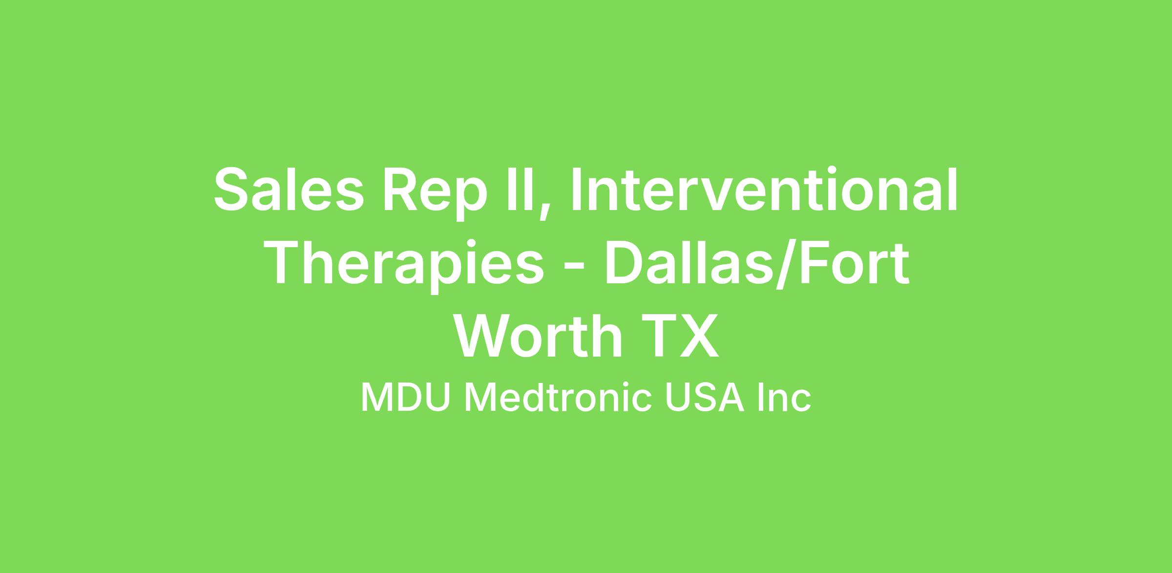 At Medtronic, the Sales Representative II, Interventional Therapies solicits orders, selling Medtronic Interventional products assigned and representing the company in accordance with its policies and in the area assigned; for maintaining awareness of local competitive conditions and for reporting back promptly to the district manager.