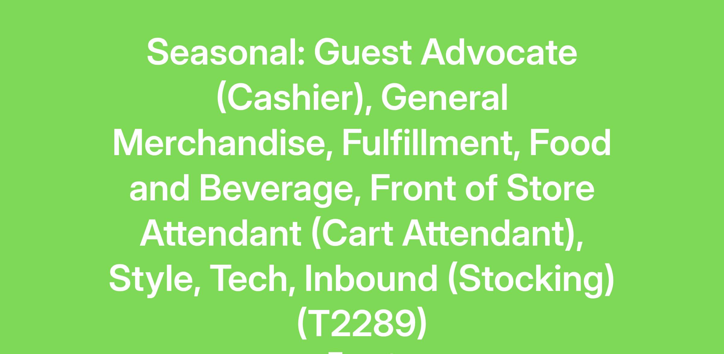 Seasonal: Guest Advocate (Cashier), General Merchandise, Fulfillment, Food and Beverage, Front of Store Attendant (Cart Attendant), Style, Tech, Inbound (Stocking) (T2289)
