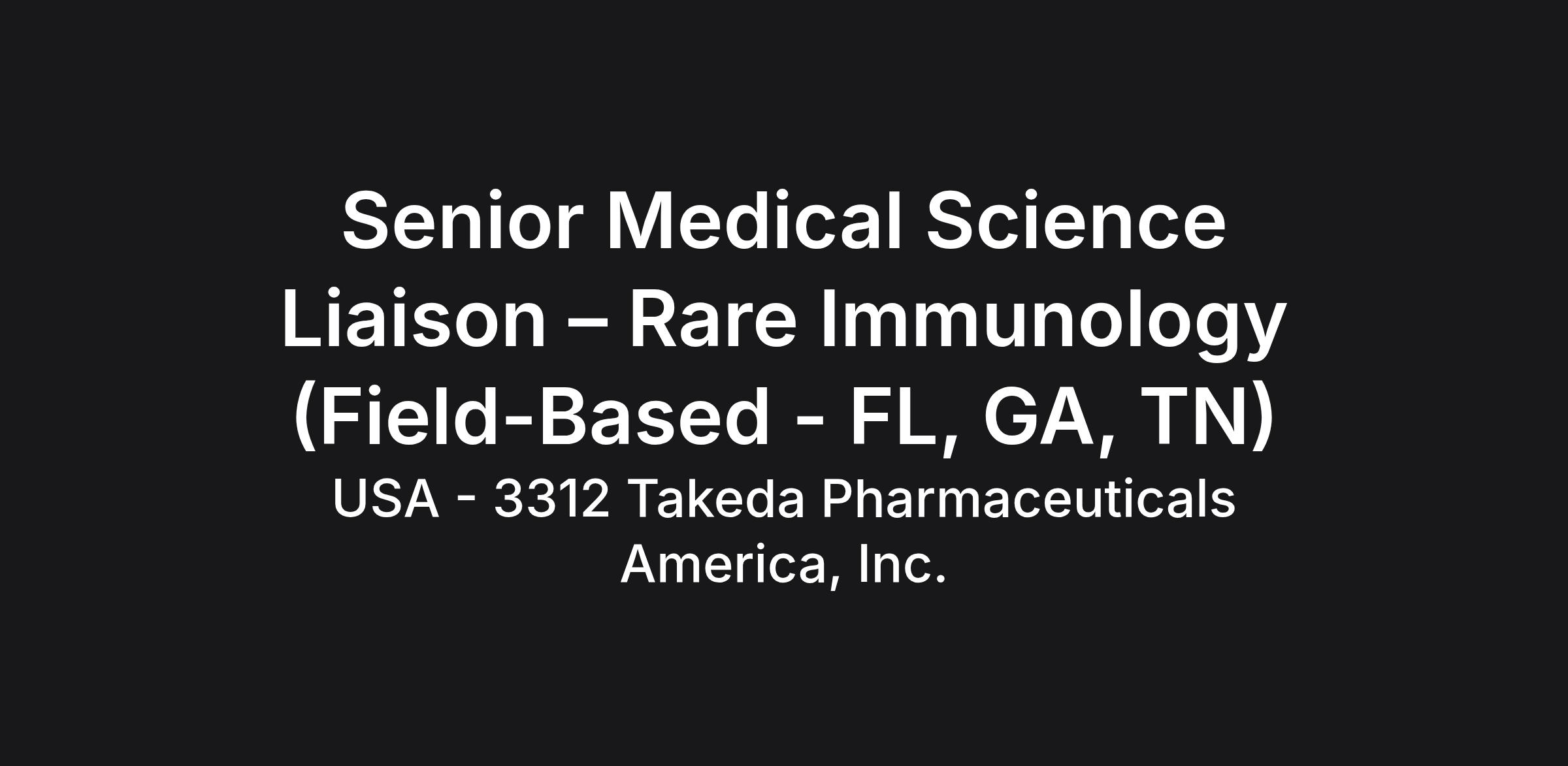 Join Takeda as a Senior Medical Science Liaison – Rare Immunology where you will be responsible for analyzing, interpreting and disseminating scientific data, acquiring and translating customer insights, fostering external expert networks, and compliantly connecting customers to Takeda to advance medical strategy and improve patient outcomes. As part of the US Medical team, you will report to the Director, Field Medical. This is a is a field-based, external customer-facing position. The territory includes FL, GA, TN.