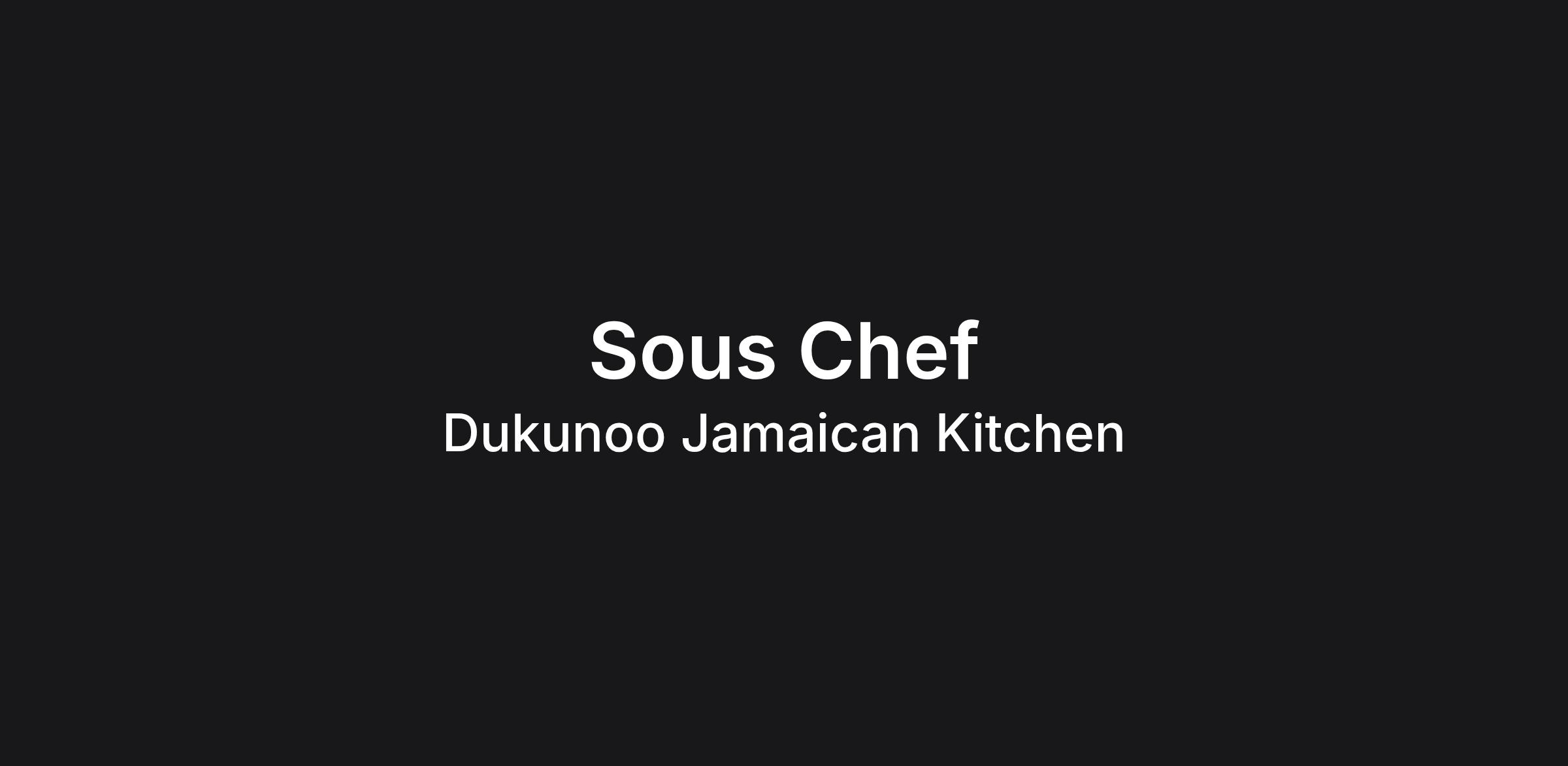 Dukunoo Jamaican Kitchen in Miami, FL is looking for one Sous Chef experienced in Jamaican Cuisine to join our 50 person strong team. We are located on 316 NW 24th St. Our ideal candidate is a self-starter, punctual, and reliable skilled.