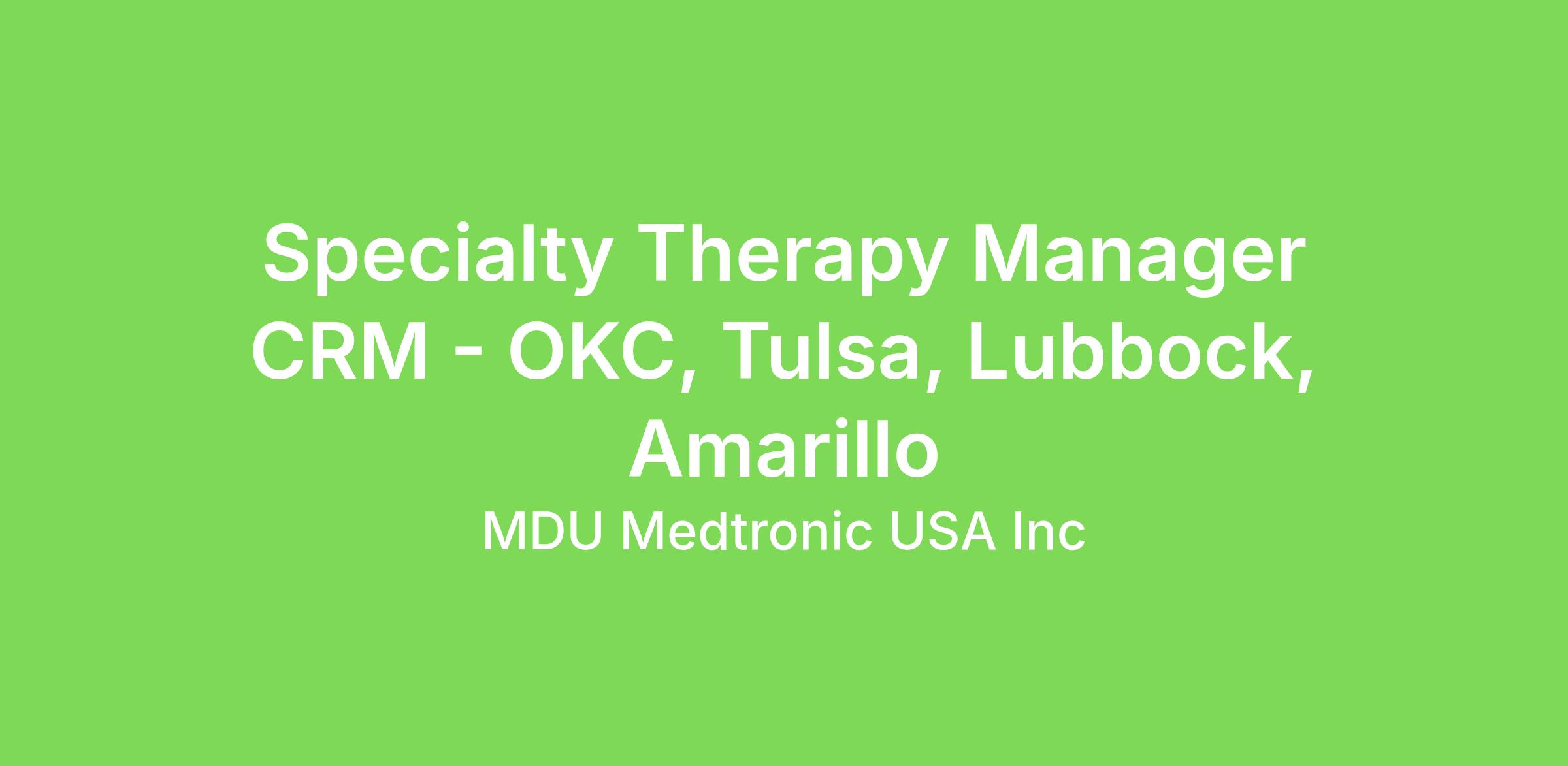 The Specialty Territory Manager is responsible for sales planning and execution, providing technical and clinical expertise and coordination of educational support to ensure safe adoption and growth of the Medtronic Micra VR & AV products (MICRA), EV-ICD, TYRX, and future Transcatheter/leadless or other innovative technologies. The Specialty Therapy Manager works closely with implanting teams and the Medtronic Cardiac Rhythm Management (CRM) field organization to drive sales execution, and procedural and practice success.